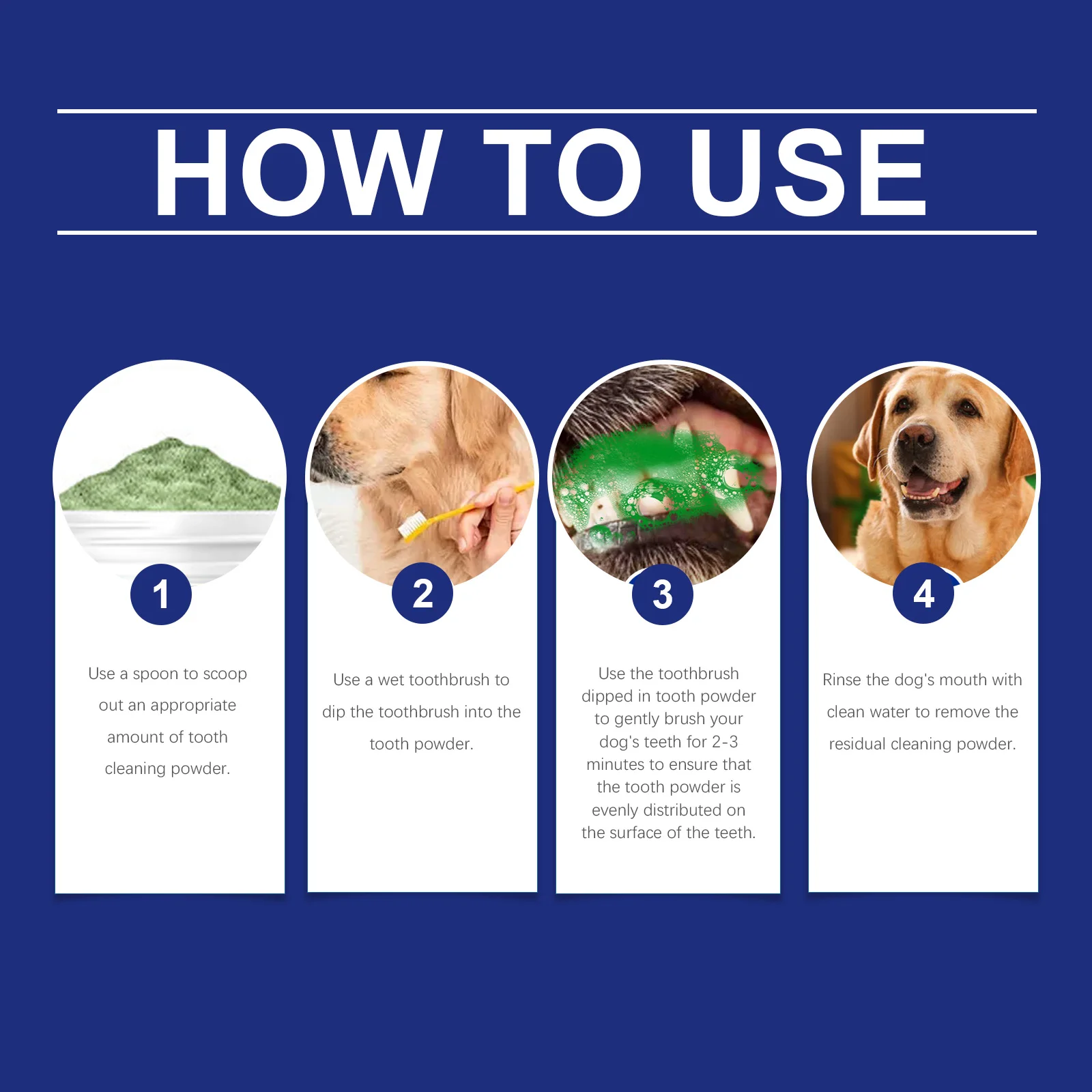 3.Use the toothbrush dipped in tooth powder to gently brush your dog's teeth for 2-3 minutes to ensure that the tooth powder is evenly distributed on the surface of the teeth.